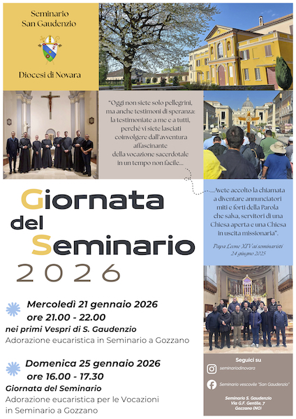 Giornata del Seminario 2026 – Seminario San Gaudenzio – Diocesi di Novara Mercoledì 21 gennaio 2026 ore 21:00-22:00 nei primi Vespri di San Gaudenzio – Adorazione Eucaristica in Seminario a Gozzano (via Giacomo Filippo Gentile, 7 – Gozzano NO) Domenica 25 gennaio 2026 ore 16:00-17:30 – Giornata del Seminario – Adorazione Eucaristica per le Vocazioni