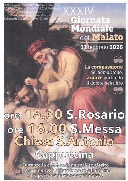 Mercoledì 11 febbraio 2026: In occasione della memoria della Beata Vergine Maria di Lourdes, Giornata Mondiale del Malato: ° Santo Rosario alle 15:30 e Santa Messa alle 16:00 – durante la celebrazione sarà conferito il Sacramento dell’Unzione degli infermi alle persone anziane e ammalate-. Essa si aggiunge alle Messe ordinarie (feriali) in cui si farÃ