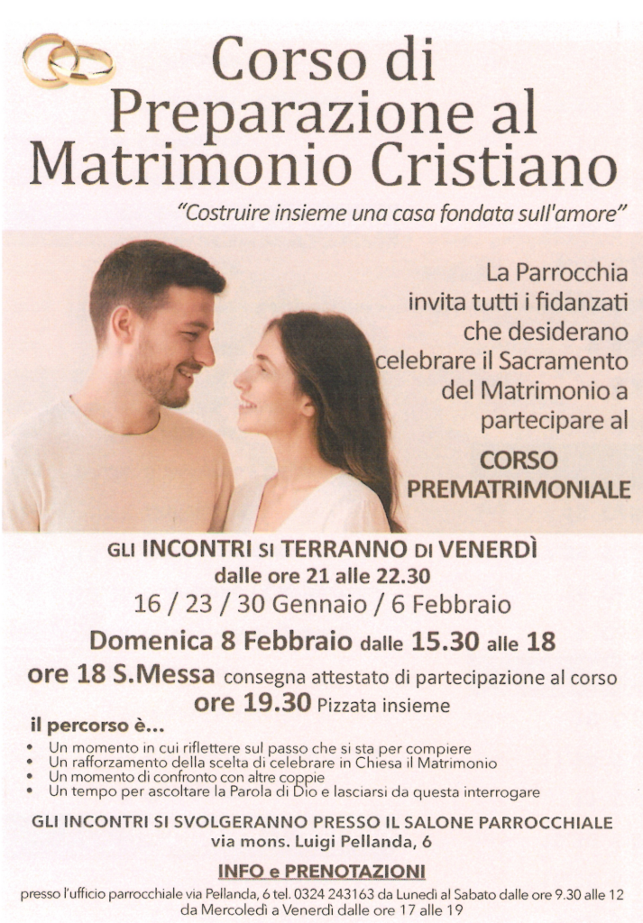 La Parrocchia invita tutti i fidanzati che desiderano celebrare il Sacramento del Matrimonio a partecipare al CORSO PREMATRIMONIALE.