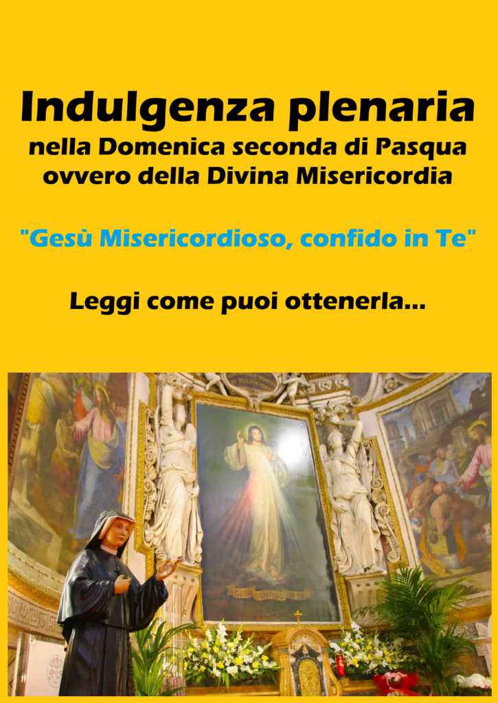 Si concede l’Indulgenza plenaria alle consuete condizioni (Confessione sacramentale, Comunione eucaristica e preghiera secondo l’intenzione del Sommo Pontefice) al fedele che nella Domenica seconda di Pasqua, ovvero della “Divina Misericordia”, in qualunque chiesa o oratorio, con l’animo totalmente distaccato dall’affetto verso qualunque peccato, anche veniale, partecipi a pratiche di pietà svolte in onore della Divina Misericordia, o almeno reciti, alla presenza del SS.mo Sacramento dell’Eucaristia, pubblicamente esposto o custodito nel tabernacolo, il Padre Nostro e il Credo, con l’aggiunta di una pia invocazione al Signore Gesù Misericordioso (p. e. “Gesù Misericordioso, confido in Te“).