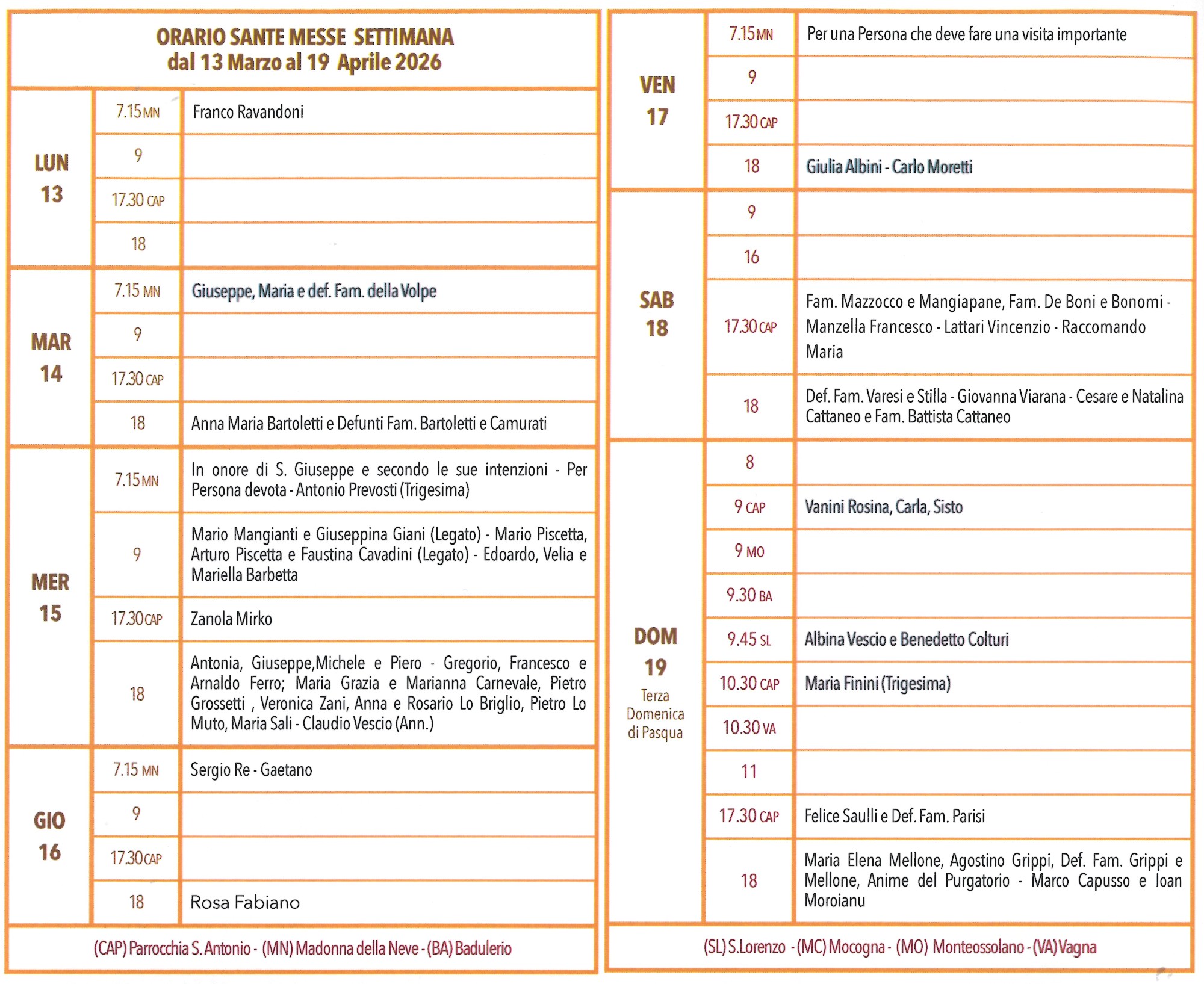 .- in alcuni periodi come i Tempi forti viene inoltre celebrata una Santa Messa feriale nella chiesa di S. Rocco in Mocogna di Domodossola. Ad esempio, per la Quaresima 2026 è celebrata il lunedì alle 18:00 (vedi articolo qui).