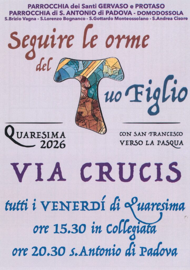 ° ore 20:30 in chiesa parrocchiale S. Antonio di Padova (venerdì 20/02/2026, 27/02/2026, 06/03/2026, 13/03/2026, 20/03/2026; invece venerdì 27/03/2026 ci sarà un evento in chiesa Collegiata e non si terrà la Via Crucis serale, ma solo quella pomeridiana)