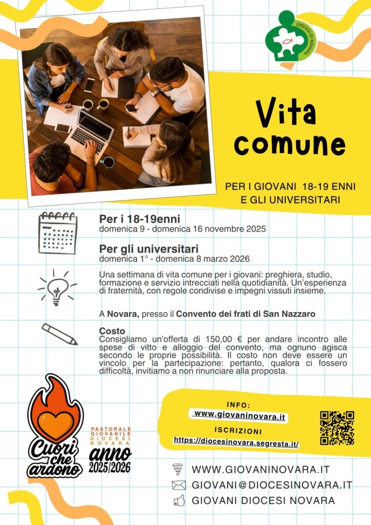 Vita comune – per i giovani 18 e 19 enni e gli universitari – 2025/2026 – 09-16/11/2025 e 01-08/03/2026 – Convento frati San Nazzaro Novara – Pastorale Giovanile – Diocesi di Novara